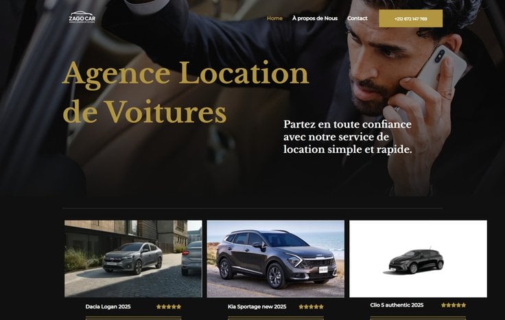 تصميم وتطوير موقع Zago Car وهو موقع إلكتروني احترافي لوكالة تأجير السيارات في المغرب، يركز على عرض أسطول حديث من السيارات مع إمكانية التواصل السريع عبر الواتساب للحجز والاستفسار.
